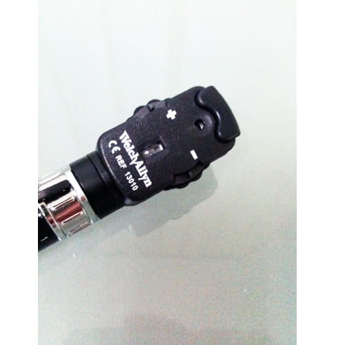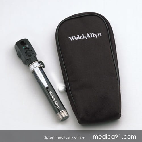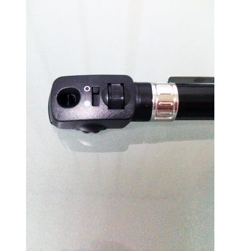 Lekki jednoczęściowy oftalmoskop z trwałego, wstrząsoodpornego tworzywa.